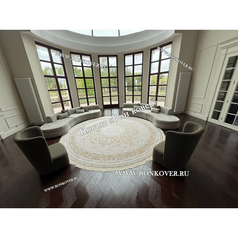 Импозантный Круглый Ковер Для Гостиной Арт 30256 наполняет интерьер комнаты теплом и уютом, гармонично сочетает в себе изящество и красоту. Он изготовлен из высококачественного сырья, комфортный и долговечный.